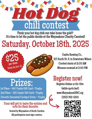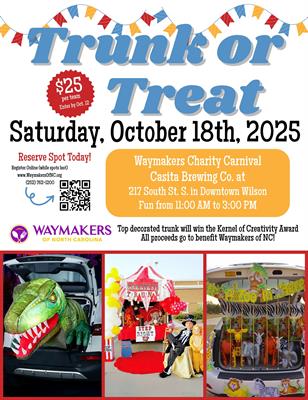 Waymakers of NC is hosting our Charity Carnival on Saturday, October 18th, 2025 at Casita Brewing Co. in Downtown Wilson!
